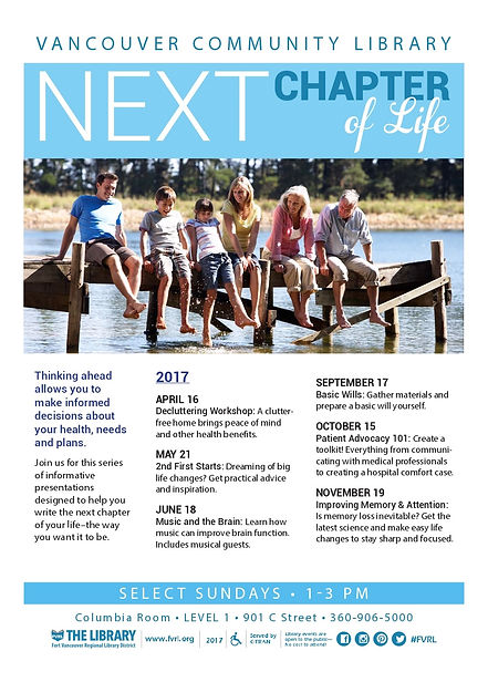 My original event topics include: Emergency preparedness, food over lawns, Vancouver's first Death Cafe, Dia De Los Muertos celebration, clothing re-fit/swap, music and the brain science, de-cluterring workshop, second life starts, making your own legal will, plant and seed swap, webmaking class, waste reduction/re-purposing/composting techniques, creative journaling workshop, advocating for a loved one in medical need, healthfully aging in place, neuroscience of reality, and more